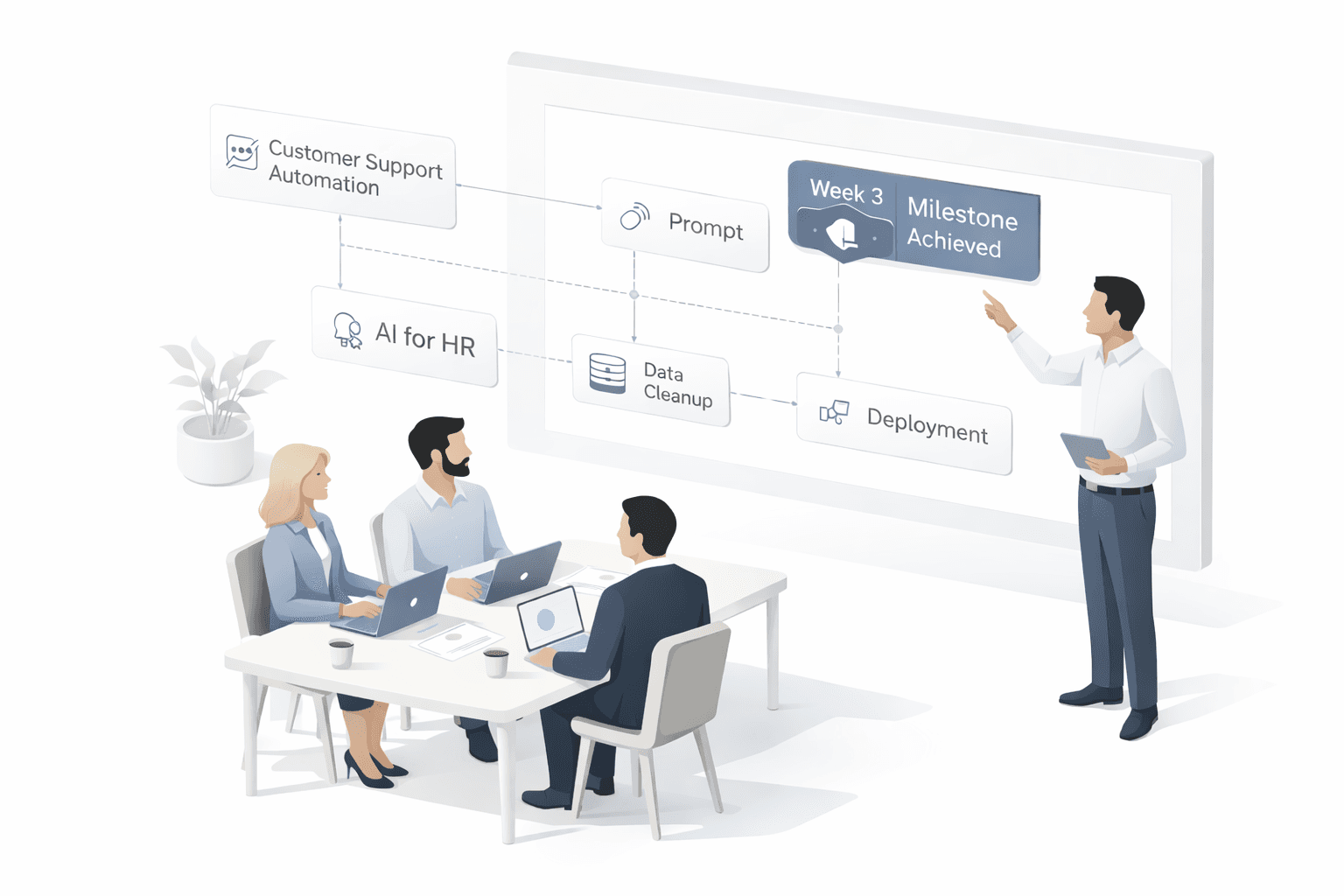 Our vision is to empower mid-size organizations with practical, measured results from AI adoption—delivered through coaching and structured enablement, not vague advice. We believe that AI without execution is useless.